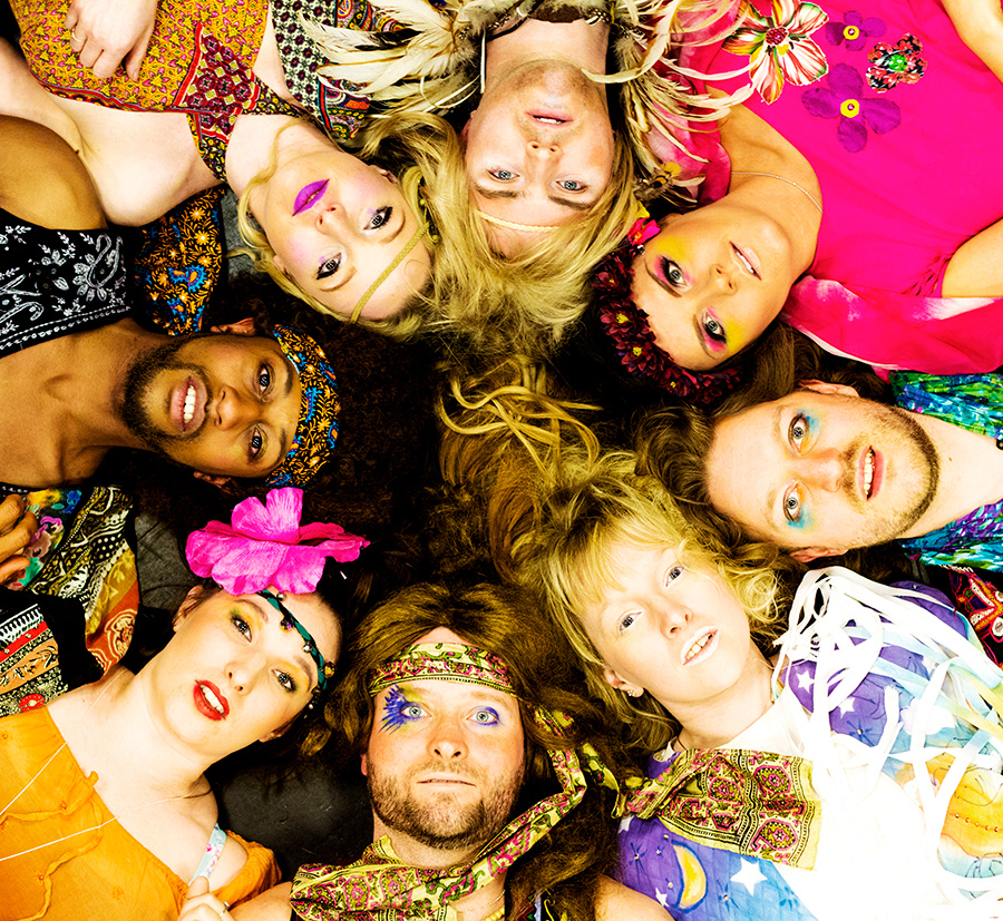 My favourite shot – possibly at the suggestion of Lemington – was to create an image with a ring of heads with interwoven hair shot from above to achieve an psychedelic "album cover" feel. It involved the camera with a key light on a monopod held aloft by a non-acrophobic assistant balancing on a high stool whilst I directed and took the shot remotely using my phone as a monitor. I'd love say it all came out in one perfect shot, but the truth is there was a little patching in from a second shot to replace the face of one actor whose eyes were momentarily closed. I employed Photoshop again to punch up the colour to create something a little more crazy and drug fuelled and worthy of the dawning of the Age of Aquarius.